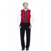 Vest: Dobbelspent vest med slag uten krage i grønn blomstret brokade eller rød klede. Grågrønt bomullstoff i rygg.
