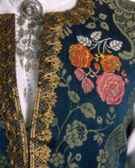 Livet er i rødt ullstoff, blå og grønn tofarget ulldamask, eller kalemank.